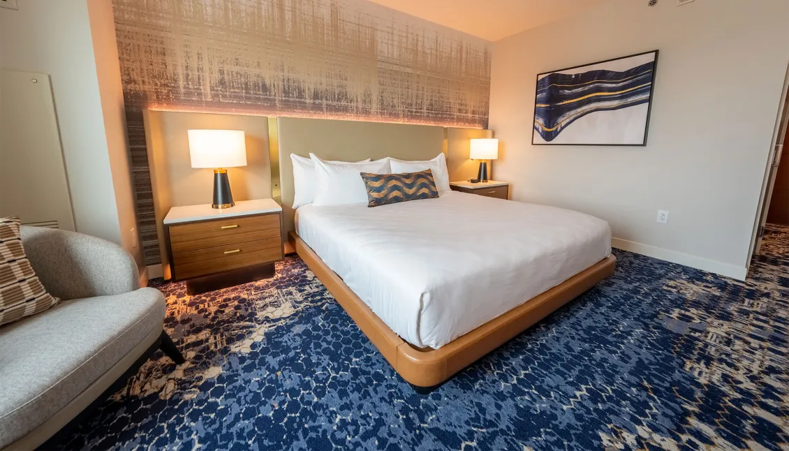 Indulge in the ultimate escape with our reimagined suite, designed for effortless style and unrivaled comfort. With a spacious relaxing living area and rejuvenating whirlpool tub, this suite redefines what it means to live – and lounge – in luxury.